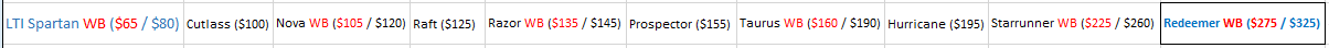 Als Beispiel nehme ich hier mal eine WB-Upgradekette, welche ich mal auf meine Redeemer gebaut habe. Die Basis war hier eine LTI Spartan (Concept Sale WB, Kosten 65 Dollar / Wert 80 Dollar = 15 Dollar gespart). Von dort habe ich für 10 Dollar auf eine Cutlass (als Lückenfüller, ohne Rabatt) aufgerüstet, dann für 5 Dollar von der Cutlass auf den Nova (15 Dollar gespart), dann für 5 Dollar vom Nova auf die Raft usw. bis ich das letzte Upgrade auf die Redeemer habe.
